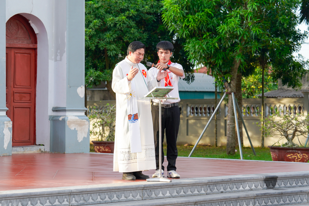 Tất cả 90 sa mạc sinh đã khởi đầu hành trình với nghi thức lên đường và chào cờ khai mạc hành trình sa mạc tại nhà thờ xứ Hoài Lai.