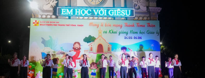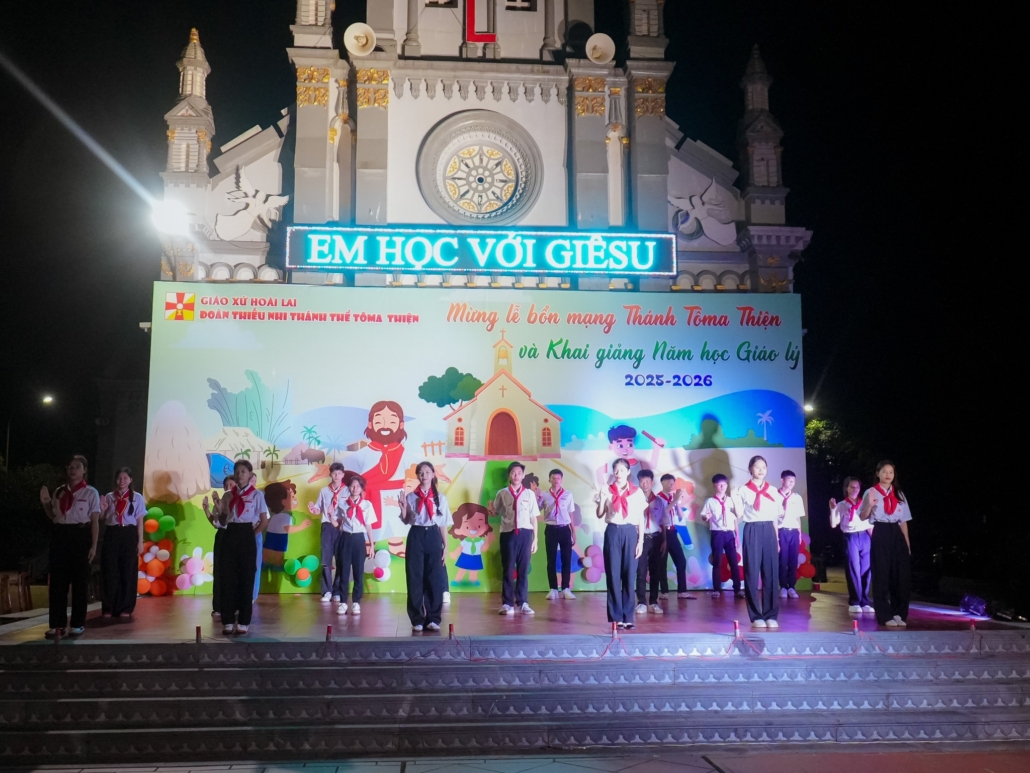 Hình ảnh các tiết mục khởi động mừng lễ Quan thầy và Khai giảng Năm học Giáo Lý của các em thiếu nhi đoàn Tôma Thiện – xứ Hoài Lai, 21/9/2025