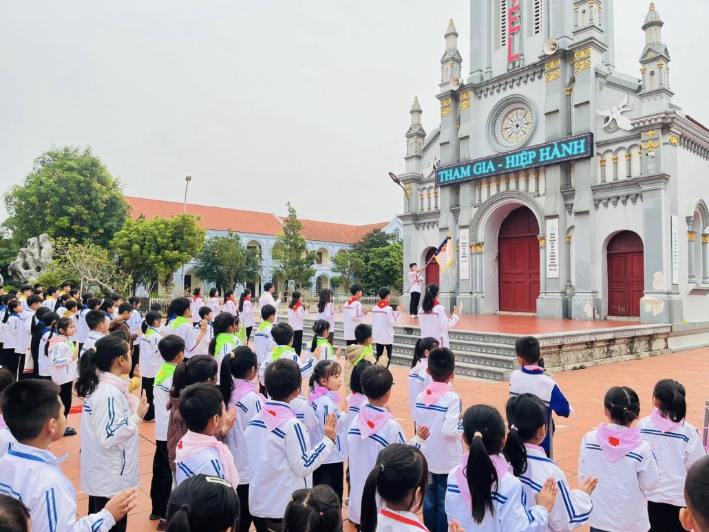 Hình ảnh đoàn TNTT Tôma Thiện tham dự nghi thức chào cờ đầu tháng với chủ đề làm việc tông đồ